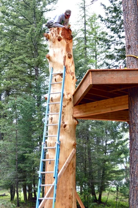 The Montana Treehouse Retreat's first treehouse just wouldn't be complete without the grand entrance of the spiral log staircase. This masterful work of art was constructed by local craftsman John Colliander of Treeworks Log & Timberframe Construction.